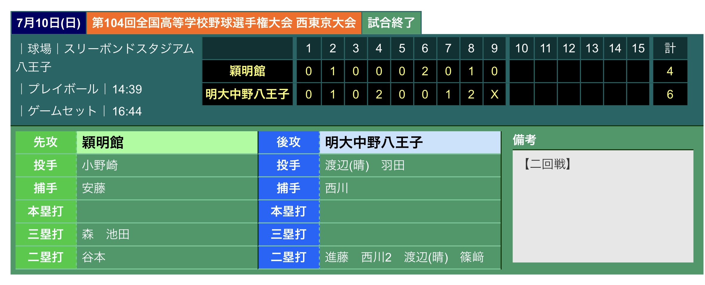 7月10日にスリーボンドスタジアム八王子(八王子市民球場)にて、第104回全国高等学校野球選手権大会西東京大会2回戦が行われ、明治大学付属中野八王子高等学校と対戦いたしました。結果は以下の通りです。