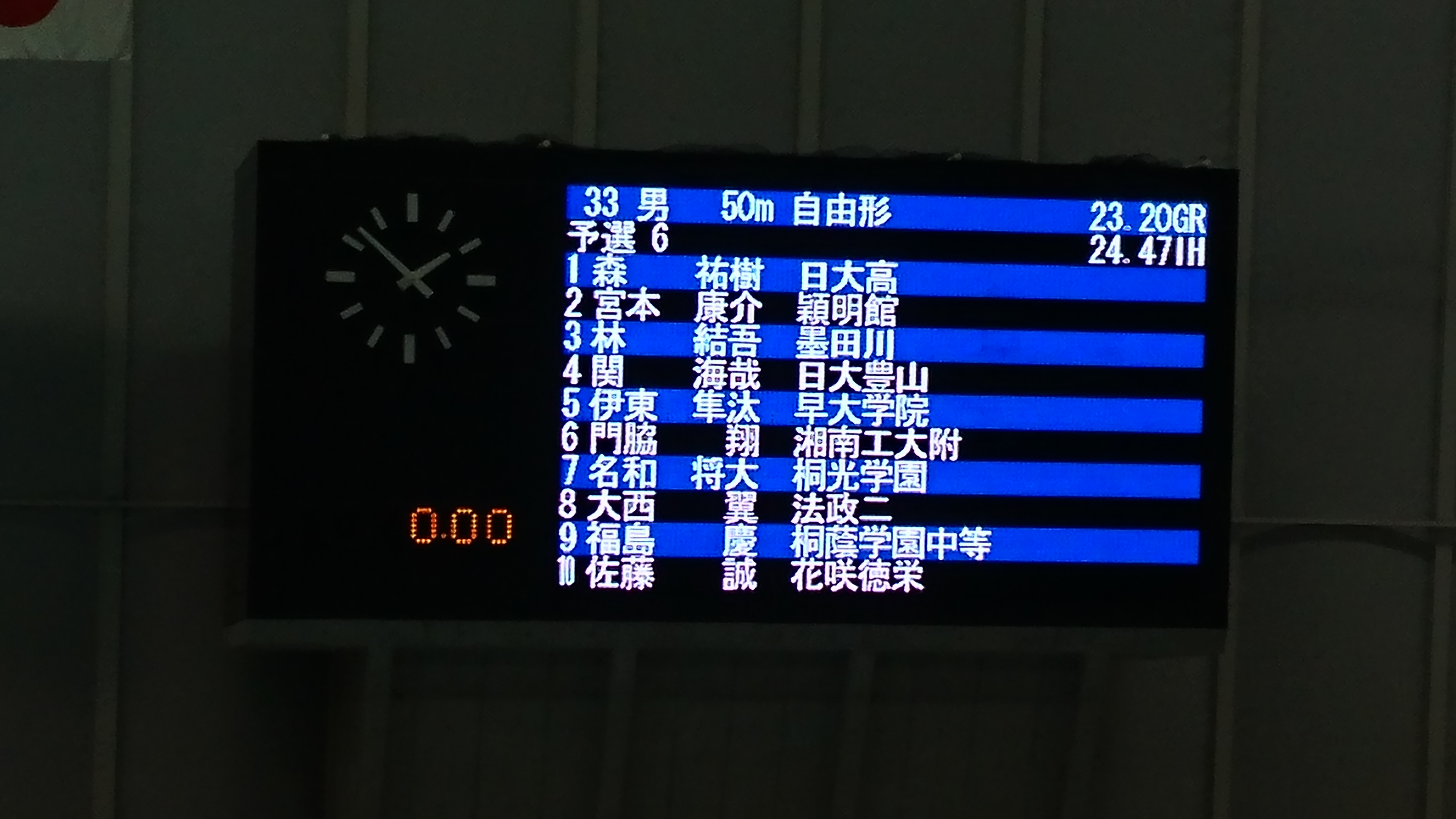50m自由形 宮本康介 24.52秒(予選27位) インターハイまで0.05秒届かず…