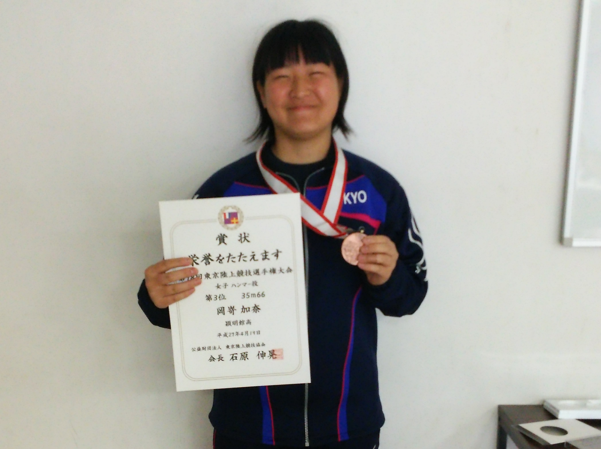 4月19日?東京陸上競技選手権大会におきまして、6年E組の岡嵜さんが女子ハンマー投げで第3位に入賞いたしました。大学生も参加している大会で第3位入賞は創部初の快挙であります。