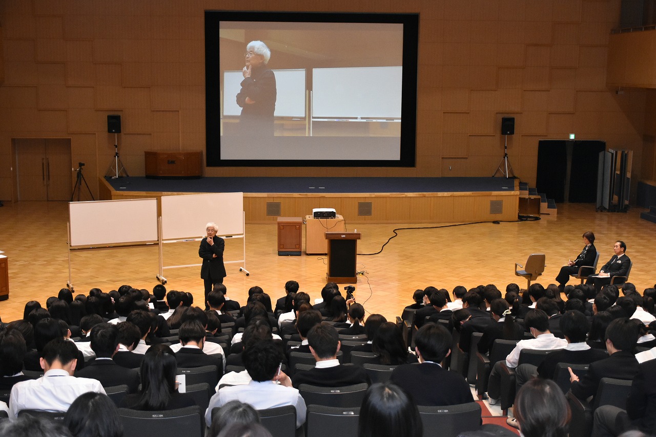 講演では、生と死、人生についての思いをはじめ、災害の日本史(大災害後の社会の変化など。「方丈記」の引用も含めて)を踏まえた、これからの日本の課題、世界の価値観の変化、さらには尾池和夫先生のご著書『2038年 南海トラフの巨大地震』の紹介など、多岐にわたるお話をしてくださいました。数多くの災害をくぐり抜け、その先を生きていく若い世代へのメッセージが伝わってきました。